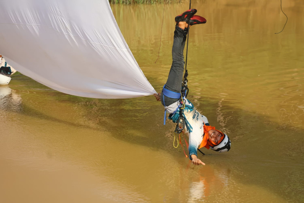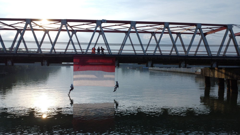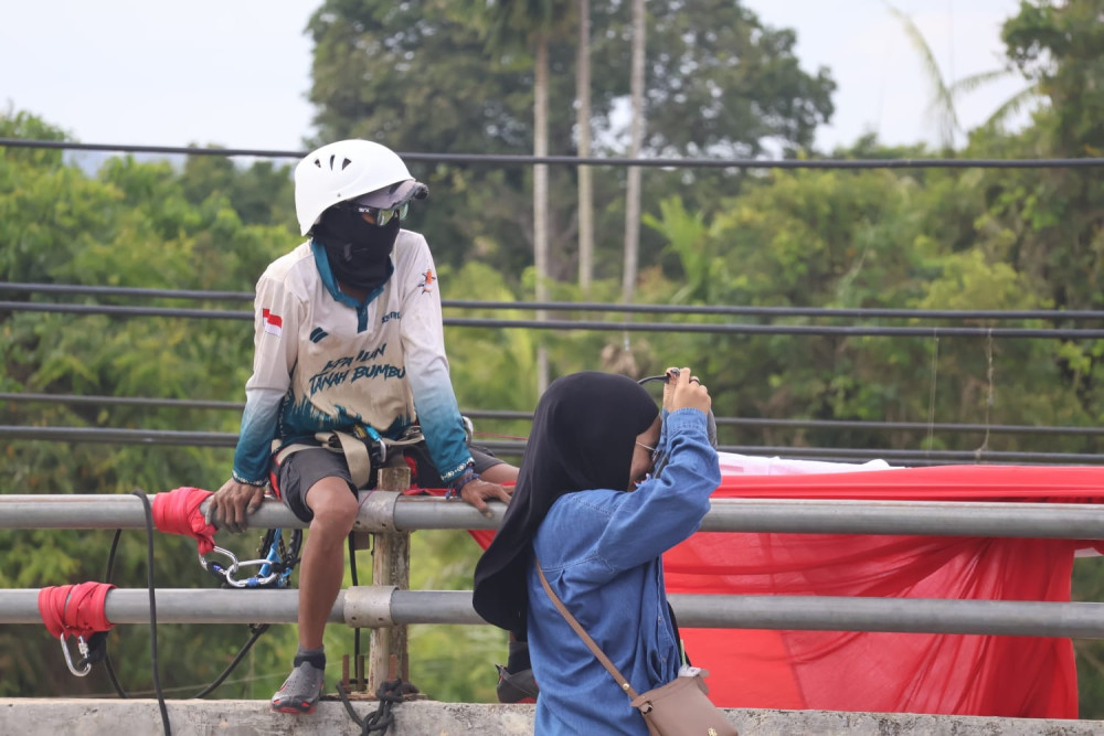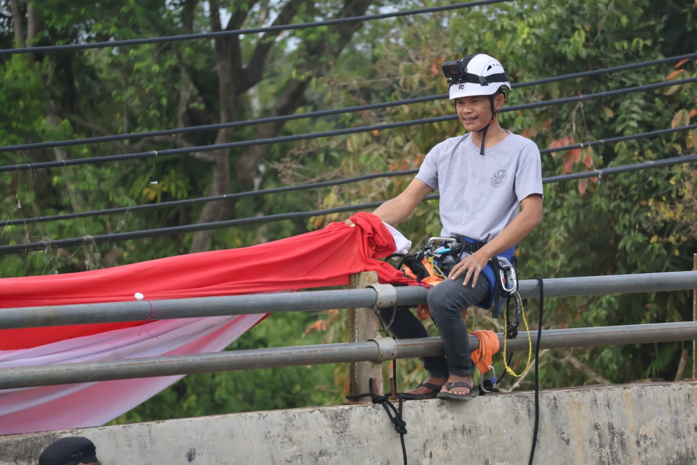 “Kalau jembatan seperti ini, kami harus gabungkan teknik panjat dengan sistem pengamanan tali,” ujar Agus. “Jadi benderanya kami bawa dari atas, terus tim turun pelan-pelan sambil memastikan benderanya bisa menggantung lurus, enggak miring atau terpuntir. Tantangannya, jembatan ini goyang terus, jadi harus jaga keseimbangan betul.”