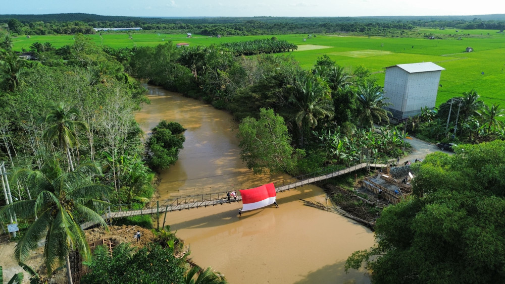 Bendera-bendera besar yang mereka pasang tak hanya mencuri perhatian warga dari jalan raya, tapi juga tampak luar biasa ketika dilihat dari udara. Dari ketinggian, warna merah putih tampak membelah sungai dan membentang di antara hutan serta perbukitan—menciptakan pemandangan yang kuat dan menyentuh.