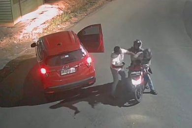 Viral! Pengemudi Mobil Merah Hantam Helm Pengendara Motor 7 Kali di Simpang Tiga Bulurejo, Kec. Mentewe