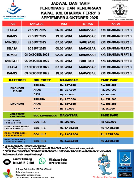 BATULICIN, KALSMART.info – Pimpinan DLU Cabang Batulicin, Jamirin, pada Sabtu (27/9/2025) menyampaikan informasi terbaru mengenai jadwal pelayaran KM Dharma Ferry 3 untuk periode September hingga November 2025. Jadwal ini meliputi rute Batulicin–Makassar dan Batulicin–Parepare, yang merupakan jalur utama penumpang dan kendaraan di Kalimantan Selatan.