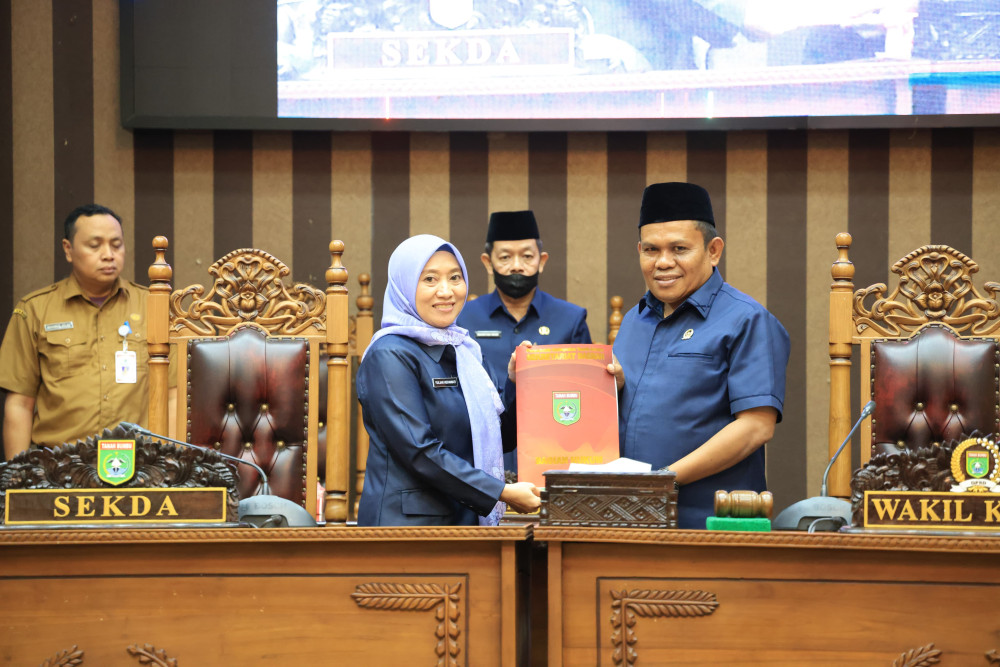 Dalam prosesi rapat, Sekda menyerahkan secara resmi dokumen Raperda kepada pimpinan rapat, Hasanuddin, sebagai tanda dimulainya pembahasan lebih lanjut antara eksekutif dan legislatif.