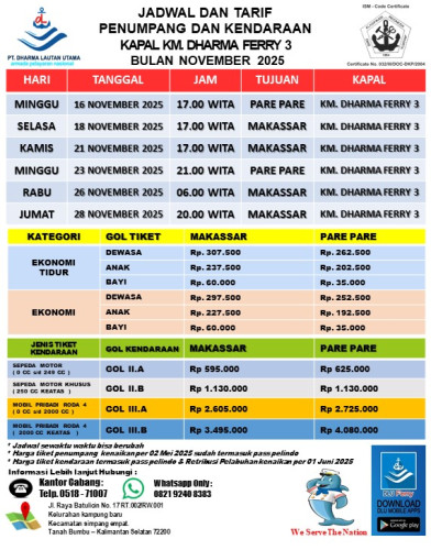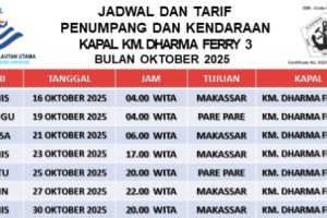 BATULICIN, KALSMART.Info – PT Dharma Lautan Utama (DLU) Cabang Batulicin resmi merilis jadwal dan tarif KM Dharma Ferry 3 untuk periode November 2025. Kapal yang melayani rute Batulicin–Makassar dan Batulicin–Parepare ini beroperasi sebanyak enam kali selama bulan tersebut.