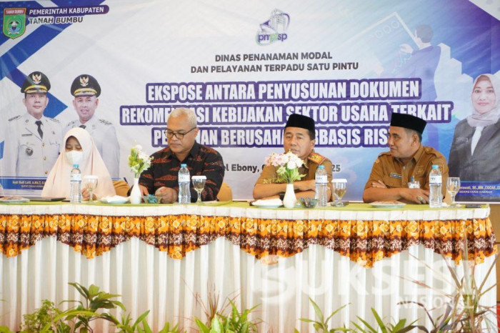 Tanah Bumbu – Pemerintah Kabupaten Tanah Bumbu melalui Dinas Penanaman Modal dan Pelayanan Terpadu Satu Pintu (DPMPTSP) menggelar Ekspose Penyusunan Dokumen Rekomendasi Kebijakan Usaha Terkait Perizinan Berbasis Risiko di Hotel Ebony Batulicin, Senin (3/11/2025).