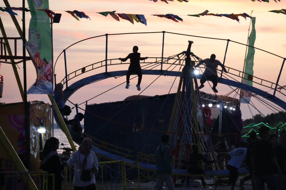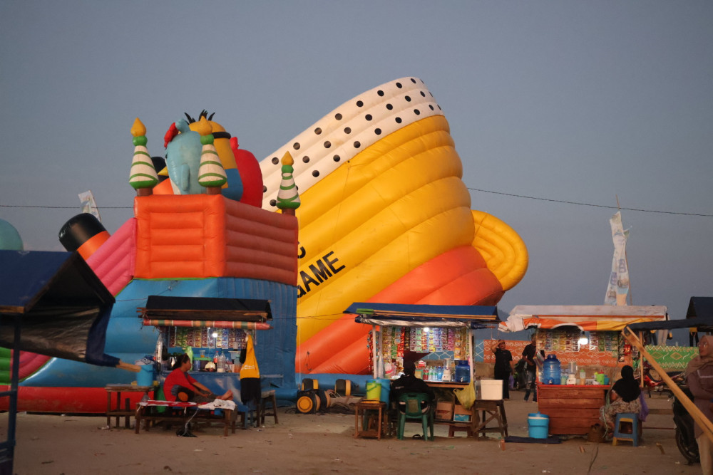 Beragam wahana permainan ikut meramaikan suasana. Anak-anak tampak antusias menjajal balon tiup, becak mini, dan skuter listrik. Di sisi lain, wahana ekstrem “kincir manusia” menjadi tontonan yang memacu adrenalin saat matahari tenggelam, membentuk siluet menawan di langit senja.