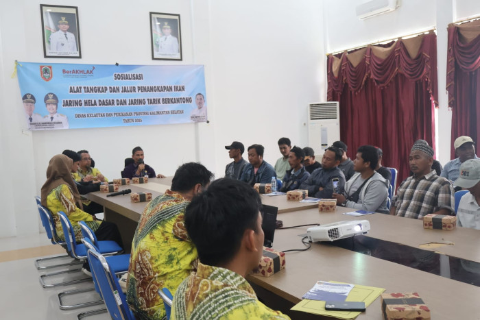 BATULICIN, KALSMART.info – Dinas Kelautan dan Perikanan Provinsi Kalimantan Selatan menggelar Sosialisasi Alat Tangkap dan Jalur Penangkapan Ikan Tahun 2025 dengan tema “Jaring Hela Dasar dan Jaring Tarik Berkantong.”